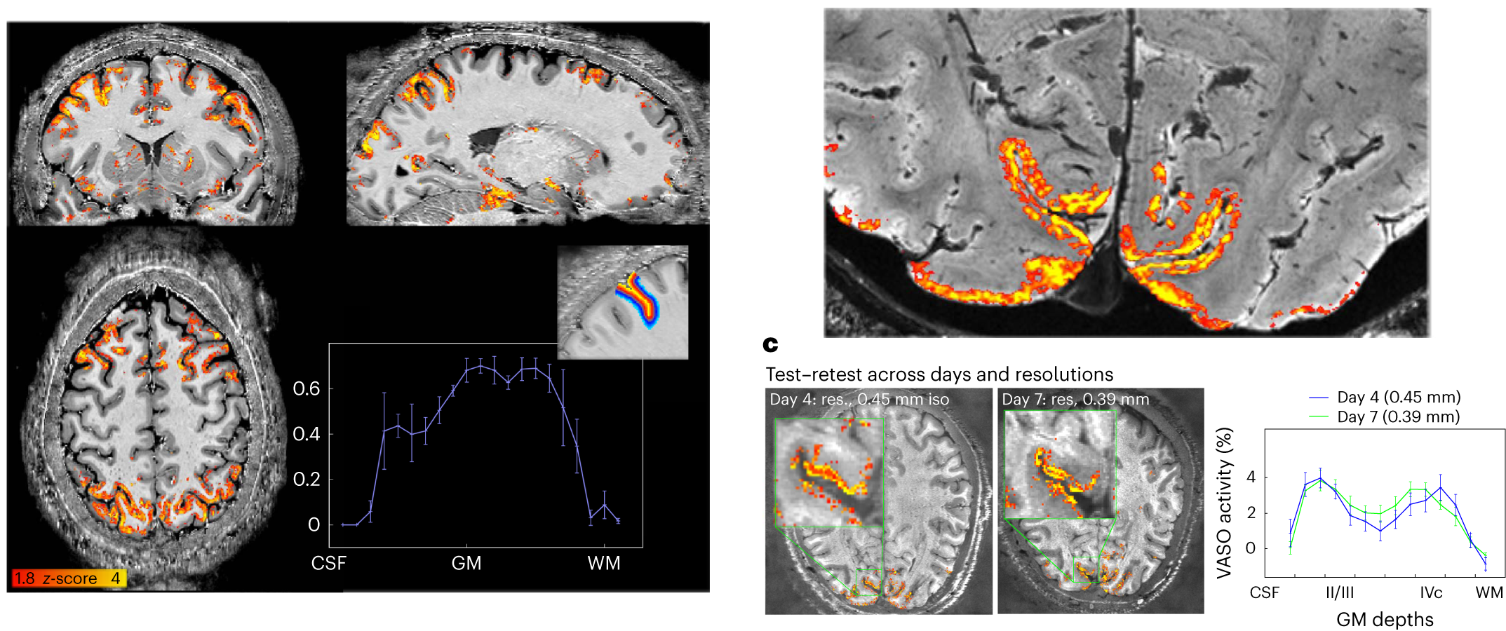 The NexGen 7T system currently has the highest-performance head gradients in a human 7T MRI scanner, creating a new operating regime for functional MRI and diffusion MRI. The scanner routinely performs functional imaging studies at 0.35–0.85 mm isotropic spatial resolution to reveal cortical layer functional activity, and achieves unprecedented high resolution in human brain functional imaging at 7T.